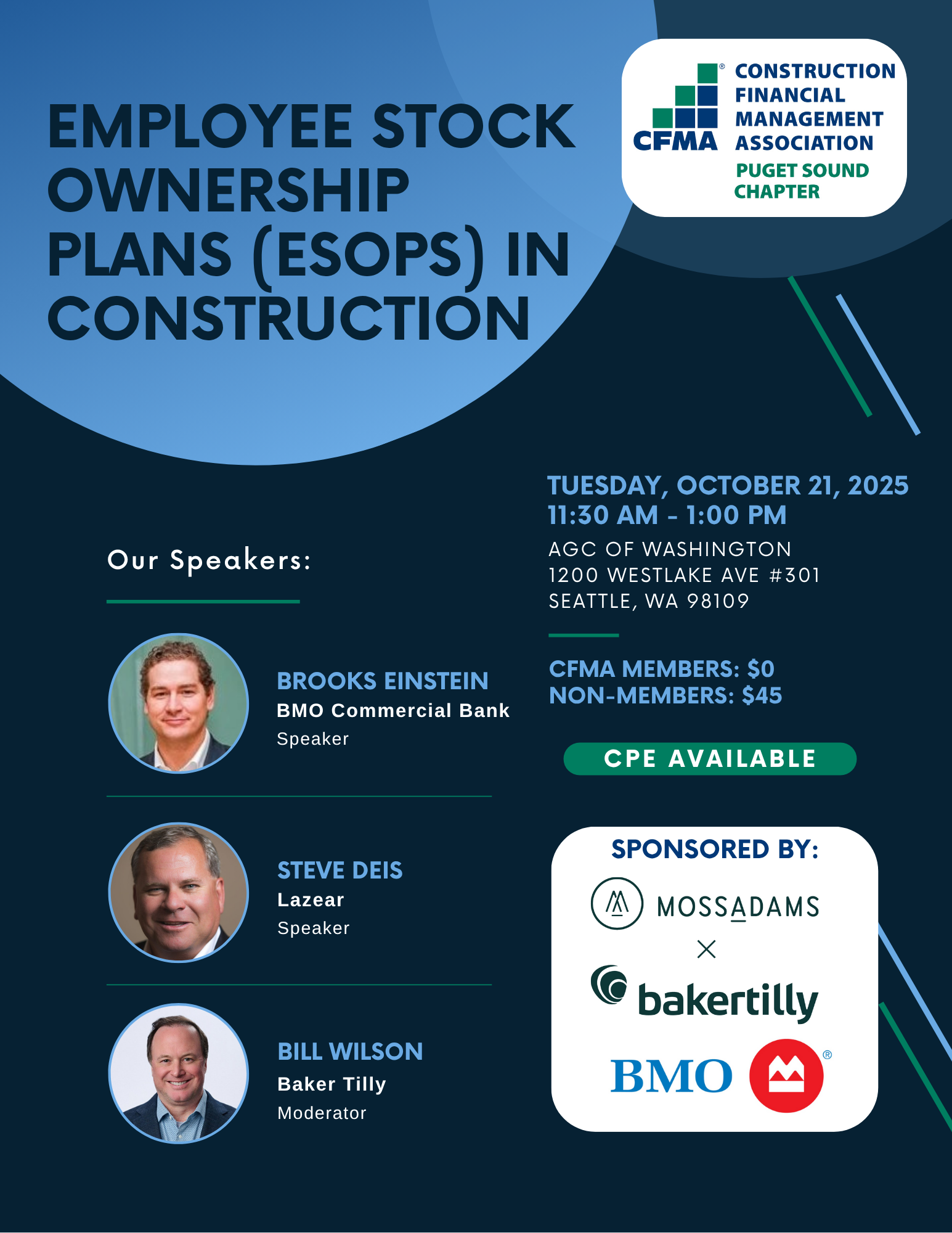 Is an Employee Stock Ownership Plan (ESOP) right for your company? This session provides a clear and practical overview of ESOPs and their potential as a succession-planning vehicle, with a focus on the construction industry. Attendees will explore the benefits ESOPs can offer to sellers, companies, management teams, and employees. The discussion will address common myths, outline the pros and cons, provide practical and real-world applications, and highlight risks specific to construction financial professionals. While ESOPs will be the central focus, the session will also touch on alternative transition strategies such as key employee buy-ins and strategic sales to help business owners evaluate the best fit for their goals.
